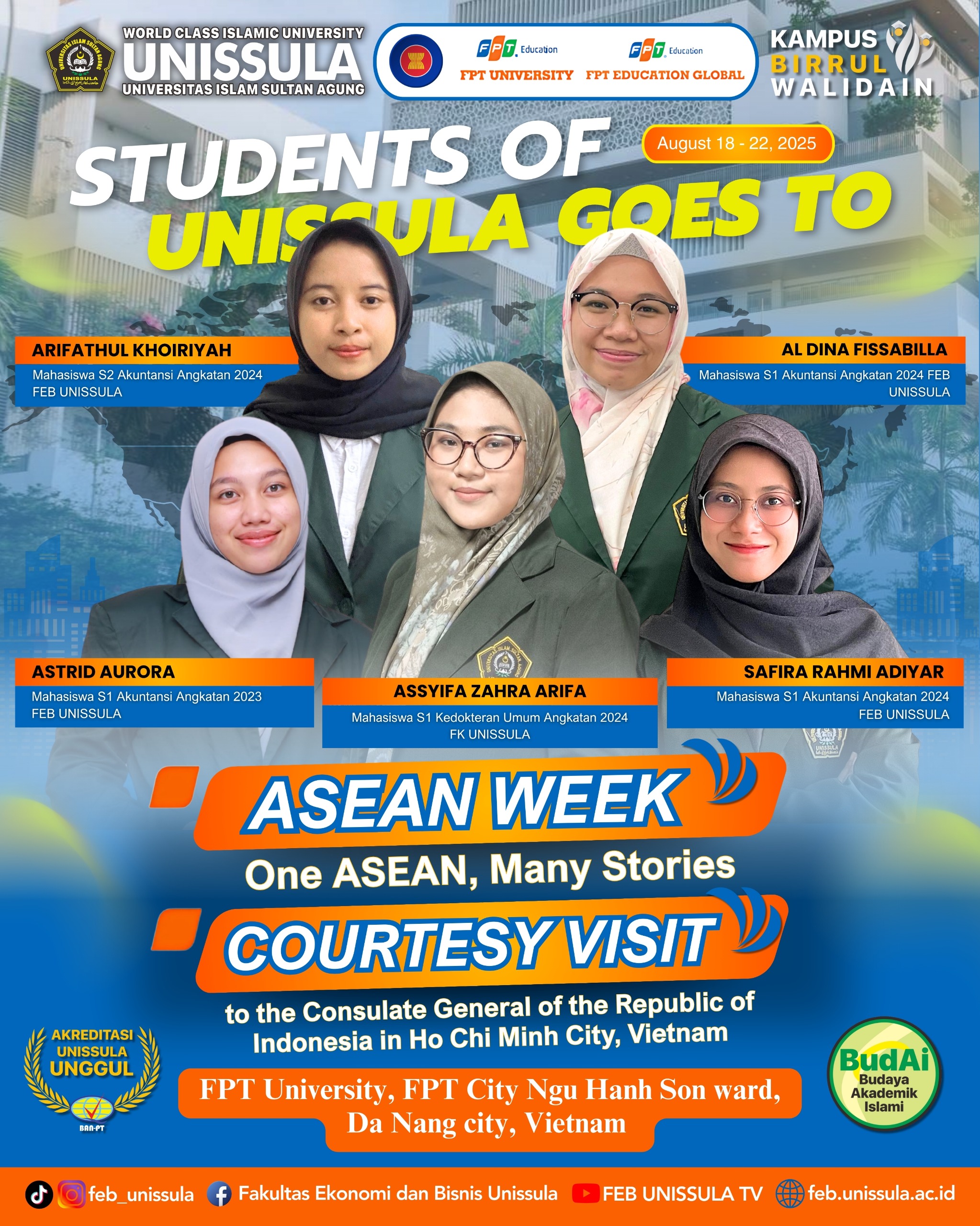 Lima mahasiswa Unissula terpilih menjadi delegasi ASEAN WEEK 2025 di FPT University, Da Nang City 18–22 Agustus 2025. Mereka adalah Arifatul Khoiryah mahasiswa S2 Akuntansi, Astrid Aurora, Safira Rahmi Adiyar, dan Al Dina Fissabilla mahasiswa S1 Akuntansi, serta Assyifa Zahra Arifa mahasiswa S1 Kedokteran Umum. Kelimanya juga akan melakukan audiensi strategis di Konsulat Jenderal Republik Indonesia (KJRI) di Ho Chi Minh City, Vietnam.
